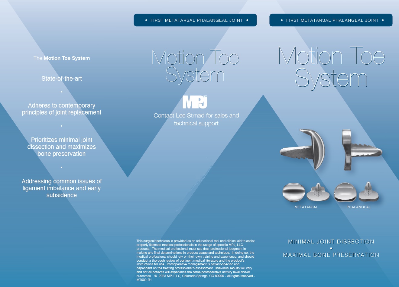 Introducing the Motion Toe System, a state-of-the-art implant meticulously crafted for the first metatarsal phalangeal joint. This innovative design adheres to contemporary principles of joint replacement, setting it apart from conventional implants. It prioritizes minimal joint dissection and